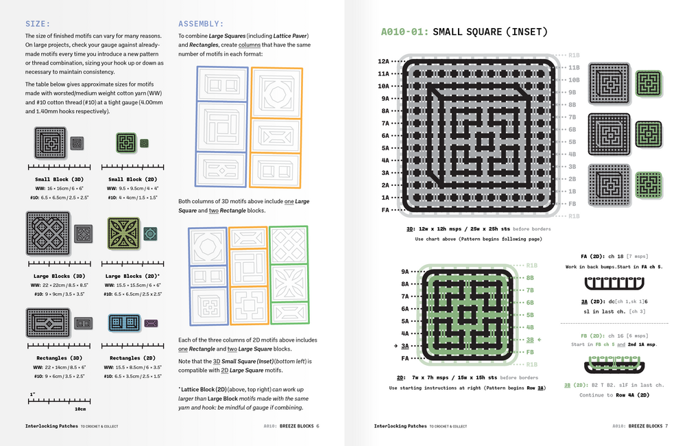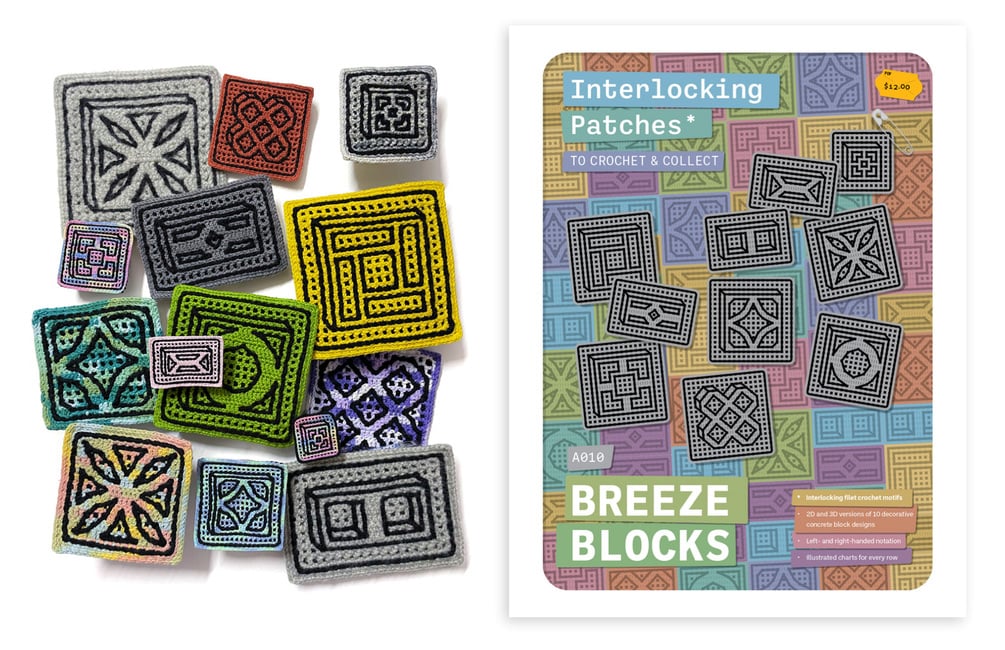 Fully-illustrated patterns for 20 interlocking filet crochet motifs — 2D and 3D versions of 10 classic Breeze Block designs: